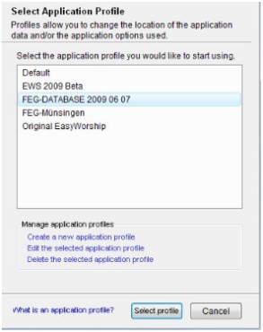 Profile bestehen aus den Benutzer-Einstellungen und den Anwendungsdaten. Anwendungsdaten bestehen aus Datenbanken, wie zum Beispiel Musik, Hintergründen, Videos, Bilder, Feeds und DVD-Clips. Benutzereinstellungen bestehen aus Einstellungen wie Schriftgröße, Farbe und Übergang Einstellungen. Es enthält auch Informationen über die Fenster grösse und deren Standort. Einstellungen wie die Ausgabe und die Monitoreinstellung sind globale Einstellungen, die sich auf alle Benutzer beziehen und sind nicht Teil der Profil-Einstellungen. Profile kombiniert die Fähigkeit von EasyWorship, mehrere Arten von Benutzer-Einstellungen und Anwendungs Daten immer wieder und an verschiedenen Standorten zur Verfügung zu stellen. Die Profil-Daten können gespeichert werden auf der lokalen Festplatte, auf einem Server oder freigegebenen Netzwerk-Ordner. EasyWorship legt ein Standard-Profil in dem folgenden Ordner an. Gemeinsame Dateien \ Softouch \ EasyWorship.